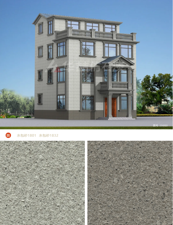 建筑外墙的装修风格多种多样,华喆仿石漆根据每位客户的需求对其进行精心的搭配,运用全新一代柔性抗裂水包砂仿石漆搭配出2021年最新外墙效果图。
